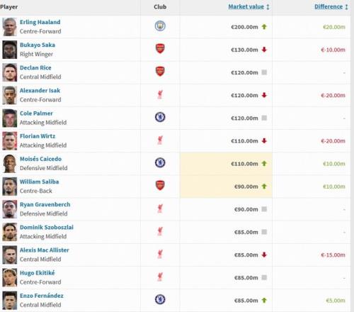 北京時間12月9日,德轉英超球員身價更新,哈蘭德漲至2億歐,薩卡降至1.3億歐,伊薩克降至1.2億歐。